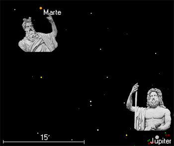 Encontro entre Marte (alaranjado) e Júpiter com algumas das suas luas (verde) na madrugada dia 18. O campo de visão na figura corresponde ao diâmetro aparente da lua e sensivelmente a uma amplificação de aprox. 70x. Ressalvando eventuais alucinações por indigestão alimentar, as estátuas romanas de Marte e Júpiter, inseridas na figura, não deverão aparecer na vista com binóculo ou telescópio.