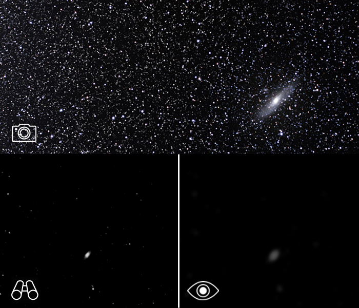 Ao olhar ao binóculo esta parece uma mancha difusa, como uma nuvenzinha transluzente. Para captar a sua estrutura em espiral ou até estrelas dentro da galáxia já é preciso um telescópio equipado com meios fotográficos. A galáxia da Andrómeda é um pouco maior que a nossa própria galáxia e daqui a 5 mil milhões de anos vai fundir-se com a nossa, tornando-se este casal de galáxias a força dominante no Grupo local.