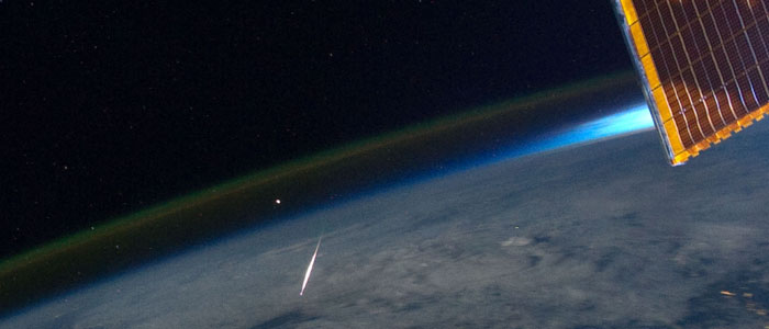 Um meteoro das Perseidas cria um rasto de ar ionizado luminoso enquanto passa pela nossa atmosfera. Captada a partir da estação espacial internacional em agosto 2011. Crédito: NASA (Ref. da imagem: ISS028-E-24847)