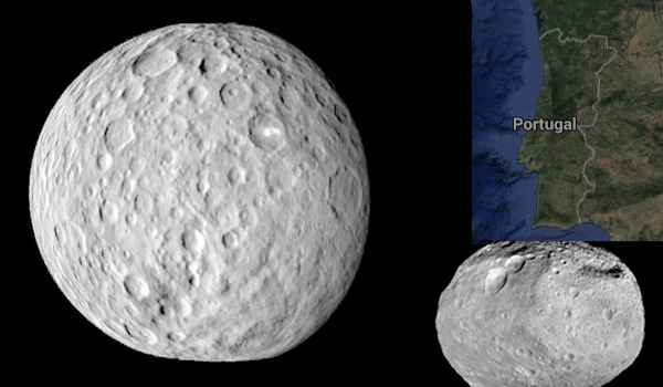 Ceres (esquerda) classificada agora de planeta anão. Fotografia tirada pela sonda DAWN atualmente em órbita depois de visitar o asteroide Vesta (direita em baixo) em 2011/12. A figura permite comparar os tamanhos. Crédito: NASA/JPL-Caltech/UCLA/MPS/DLR/IDA