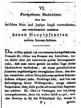 Comunicado mensal da Polícia Celeste em Julho 1801 publicado por Von Zach (ver texto). O título lê: Notícias continuadas sobre o novo planeta principal do nosso sistema solar há muito previsto e provavelmente descoberto entre Marte e Júpiter.