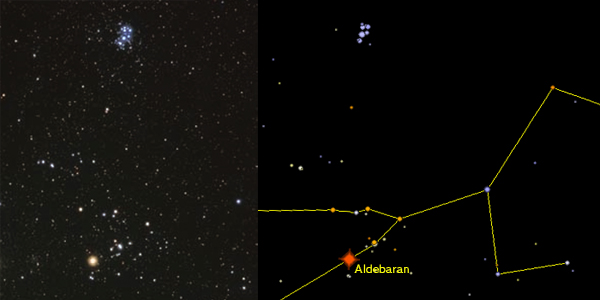 Esquerda: A imagem mostra os enxames das Híades (um V deitado em baixo) e das Plêiades (estrelas azuladas em cima). As Híades são mais antigas e por isso espalharam-se mais que o enxame vizinho. Direita: A mesma área da fotografia em forma de mapa estelar. As linhas de constelação perfazem parte do Touro, cuja estrela principal é Aldebaran. As Híades em torno dela representam os cornos da figura do Touro. Crédito: Matthies, GRM/NUCLIO
