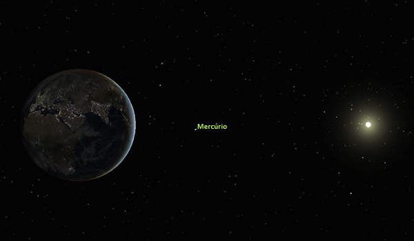 A Terra em órbita ao Sol no momento do periélio, a sua maior aproximação. Portugal, emergindo no bordo esquerdo, está a uma hora da meia-noite.Com um pouco de imaginação entende-se que Mercúrio, a esquerda do Sol, estava bem visível no horizonte logo após o pôr do Sol. A escala respeita diâmetros e distâncias (Terra vista a 55000 km de distância). Crédito: GRM/NUCLIO
