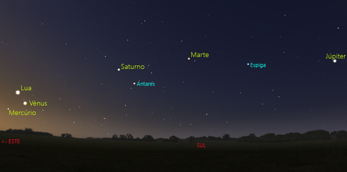 O céu mostra de uma só vez todos os planetas conhecidos aos povos antigos. Todos pairam sobre o horizonte do céu matinal, deste Mercúrio, o mais perto do Sol, até Saturno, o mais afastado. Que a proximidade direta com a Terra não significa maior brilho, prova o planeta Marte, o mais difícil de identificar. No dia 6, a Lua, considerada planeta pela gente da antiguidade, junta-se a Vénus. A ilustração mostra o céu do dia 6 às 6:50 horas. Basta esperar nem uma hora para ter o Sol sobre o horizonte. O Sol em tempos também era visto como fazendo parte dos planetas. Assim, numa só hora completa-se o Sistema Solar a vista de todos como era conhecido até fins do século XVIII.