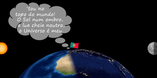 Mudando a perspetiva da imagem acima para mais perto do polo sul, coloca Portugal no topo do mundo. Às 18:20 do dia 22.2., assumindo boa visibilidade, basta virar-se para norte ou sul e olhar sobre cada ombro. Ao virar a cabeça para oeste vê se o Sol desaparecer, ao virar para leste, aparece a Lua no momento da fase cheia. Quem quer que esteja a observar este momento encontra-se perfeitamente alinhado aparentemente a meio entre estes dois astros. A figura não respeita escalas nem distâncias. Crédito: Earth Viewer/GRM
