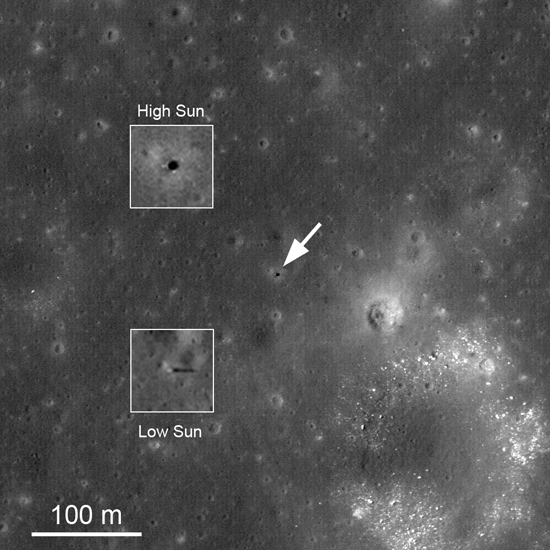 Fotografias da sonda Surveyor 6 na lua. Ela encontra-se também próximo do local dos destroços da Surveyor 4. Os recortes mostram a sonda Surveyor 6 na superfície lunar a ser iluminado pelo Sol de cima (lua cheia) e de lado, como no dia 31, aquando do quarto minguante. Crédito: NASA/Goddard/Arizona State University
