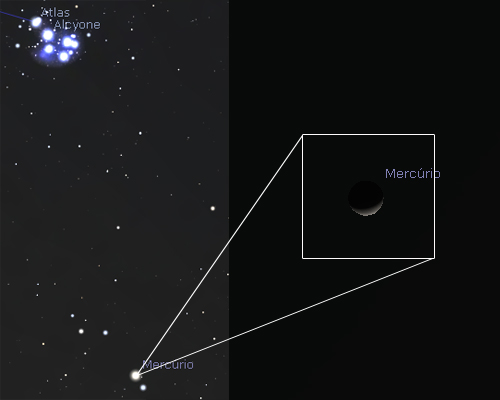 Esquerda: Mercúrio situa-se atualmente cerca de 9° por baixo do enxame das Plêiades. Esta distância no céu corresponde sensivelmente a largura do punho, sem o polegar, visto com braço esticado.