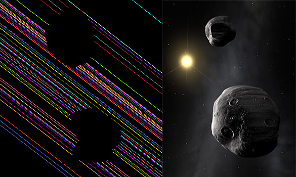 Nas ocultações de estrelas por asteroides, cada observador, conforme a latitude geográfica, vê a luz da estrela (uma linha colorida por cada observador) até esta repentinamente desaparecer (sem linha) e pouco depois reaparecer (continuação da linha). As horas exatas comunicadas por todos os observadores permitem criar um diagrama dentro do qual se cristaliza a forma do asteroide. Neste caso particular foi um asteroide duplo chamado 90 Antiope, cuja rendição artística se encontra do lado direito. Crédito: ESO, GRM