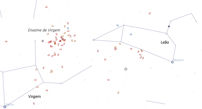 As galáxias do enxame de Virgem (círculos vermelhos) situam-se entre Leão e Virgem com Coma Berenice por cima. Embora algumas galáxias possam ser avistadas num telescópio de tamanho pequeno (>80 mm abertura), para gozar em pleno a riqueza desta paisagem celeste é necessário recorrer a fotografia de longa exposição.