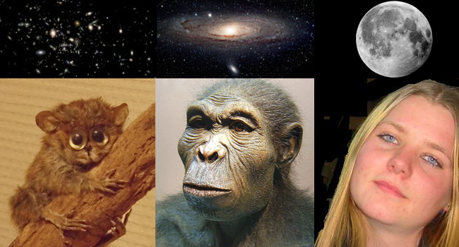 A luz que hoje vemos do enxame de Virgem (esq.cima) nasceu junto com a teilhardina (esq.), que fazia parte dos primeiros primatas há 50 milhões de anos. A luz da galáxia da Andrómeda (centro cima) tem 2,5 milhões de anos de idade tal como o homo habilis (centro bx.), o habilidoso, o engenheiro sem licenciatura. Apenas um segundo de luz nos separa da Lua, tempo insuficiente para o homo sapiens sapiens (dta.bx.) evoluir para algo mais sábio.