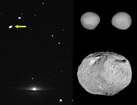 Esq.: O rasto do asteroide 7-Iris manifesta-se nesta exposição de 45 min obtida há uma dúzia de anos quando o calhau de 200 km de largura passou projetado perto da galáxia do Sombreiro (M104).