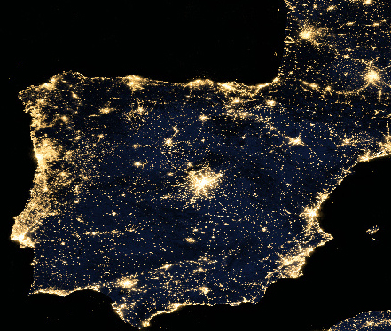Cada ponto de luz, nesta imagem de satélite da Península Ibérica, à noite, é uma luz que acaba no espaço e não em solo terrestre. Para um país em crise parece que estamos bastante melhor que os vizinhos, ou não desperdiçaríamos mais dinheiro que eles em luz elétrica para iluminar a barriga dos aviões. Eis uma razão para o aumento dos impostos. Crédito: NASA