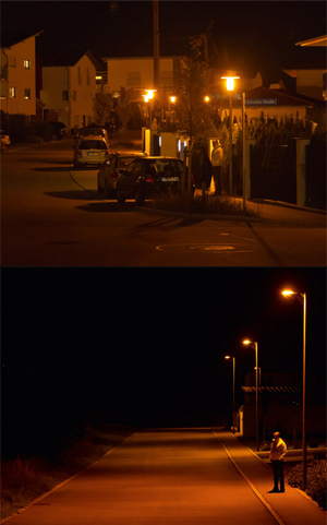 Em cima: Iluminação errada e excessiva. A pessoa mal dá nas vistas, esteja ela com boas ou más intenções em relação aos carros próximos. INSEGURANÇA pública. Em baixo: Iluminação aceitável. A pessoa é facilmente vista, mesmo que não tenha uma lanterna. SEGURANÇA pública, muitos milhões de Euros municipais poupados em energia (à escala do município). Crédito: C.Przygoda