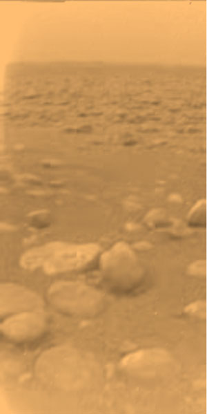 Imagem obtida pela sonda Huygens na superfície de Titã no dia 14 de Janeiro de 2005. Os blocos de forma arredondada foram presumivelmente moldados por fluidos ao longo do tempo. Os blocos maiores são constituídos por gelo revestido com uma camada de tolinas da qual ainda hoje não se conhece ao certo a composição exacta. Créditos: ESA/NASA/LPL-Univ. Arizona.
