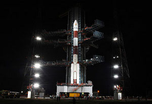 O foguetão PSLV-C11, bordo do qual viajou a sonda Chandrayaan-1, na plataforma de lançamento. Créditos: ISRO.