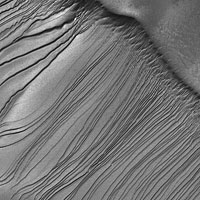 Marcas da presença de fluidos na superfície de Marte, de origem desconhecida. Crédito: NASA/JPL/MSSS.