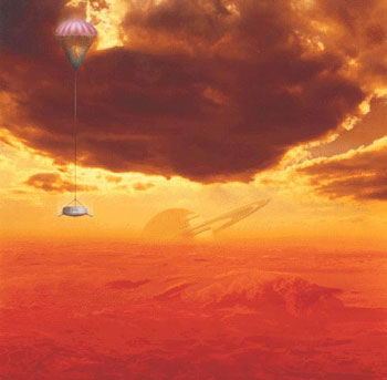 Uma impressão artística da descida da Huygens na atmosfera de Titã. Será que a realidade é assim ? Em meados de Janeiro de 2005 esperamos saber !