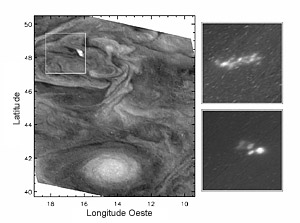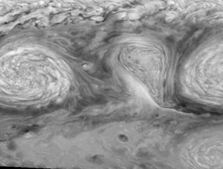 Na atmosfera de Júpiter há ciclones e anti-ciclones. Os dois Ovais Brancos formaram nos anos 30, a Sul da Grande Mancha Vermelha. No meio se encontra um anti-ciclone. Clique na imagem para ver uma animação. Crédito: NASA
