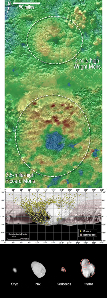 Em cima: Utilizando imagens da superfície de Plutão obtidas pela New Horizons para criar mapas topográficos 3-D, os cientistas descobriram que duas das montanhas de Plutão, Wright Mons e Piccard Mons, podem ser vulcões de gelo. A cor representa variações em altitude, com o azul a indicar o terreno menos elevado e o castanho a maior elevação. Os terrenos verdes estão a alturas intermédias. Ao centro: A localização das mais de 1000 crateras mapeadas em Plutão pela missão New Horizons indica uma ampla gama de idades para a superfície do planeta anão, o que significa que Plutão tem sido geologicamente ativo ao longo da sua história. Em baixo: Dados da missão indicam que pelo menos duas (e possivelmente todas as quatro) das pequenas luas de Plutão podem ter resultado de fusões entre luas menores. Se esta descoberta for confirmada, com uma análise mais aprofundada, pode fornecer novas e importantes pistas sobre como se formou o sistema de Plutão. Créditos: NASA/JHUAPL/SwRI.