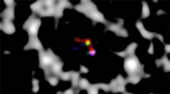 Imagem composta de LkCa15, que mostra os dados MagAO, em H-alfa (azul), e os dados LBT, nas bandas K e L (verde e vermelho). A cinzento, a imagem milimétrica do disco, anteriormente publicada. Crédito: Stephanie Sallum.