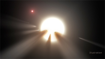 muito longa e excêntrica em torno da estrela. À cabeça estará um grande cometa, que terá bloqueado a luz da estrela em 2011, como foi observado pelo Kepler. Mais tarde, em 2013, o resto da família, um bando de fragmentos variados deixados para trás, terá passado em frente à estrela e novamente bloqueado a sua luz.