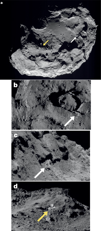 Imagens do cometa 67P/Churyumov-Gerasimenko, capturadas pela Rosetta, que mostram duas manchas de gelo de água exposto (vistas em grande plano nas imagens c e d). Crédito: Filacchione et al. and Nature.