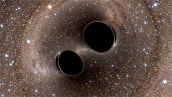 Uma simulação de computador mostra a colisão de dois buracos negros, um evento extremamente poderoso que permitiu ao LIGO detetar, pela primeira vez, ondas gravitacionais. Crédito: SXS Lensing.