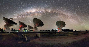 Os radiotelescópios do ATCA (Australian Telescope Compact Array), que ajudaram a identificar a mais recente explosão rápida de rádio numa galáxia a cerca de 6 mil milhões de anos-luz de distância. Crédito: Alex Cherney.