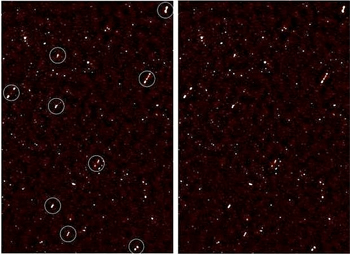 Imagem do mapa profundo de rádio, cobrindo a região de ELAIS-N1, com jatos de galáxias alinhados. A imagem da esquerda é a mesma da direita, mas com círculos brancos em torno das galáxias alinhadas. Crédito: Prof. Russ Taylor.