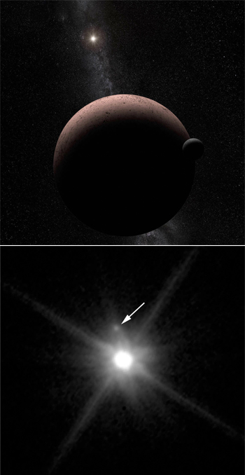 Em cima: Ilustração que mostra o distante planeta anão Makemake e a sua lua MK 2, agora descoberta. Créditos: NASA, ESA, and A. Parker (Southwest Research Institute). Em baixo: Imagem do Hubble que revela a primeira lua descoberta em torno do planeta anão Makemake. O pequeno satélite, localizado logo acima de Makemake, na imagem, é pouco visível porque se perde quase totalmente no brilho do planeta anão. Créditos: NASA, ESA, and A. Parker and M. Buie (SwRI).
