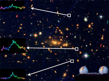 Imagem RGB do enxame feita com Hubble (três filtros diferentes foram combinados para obter uma imagem em RGB). Na inserção, são mostrados os três espectros das três imagens obtidas da galáxia. Os picos no mesmo comprimento de onda revelam que os espectros pertencem a uma mesma fonte. Crédito: Bradac/HST/W. M. Keck Observatory.