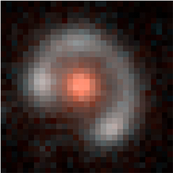 Nesta imagem composta, a galáxia lente central surge a vermelho e, em redor, o anel de Einstein, a imagem distorcida de uma galáxia distante, é visível a azul. Crédito: Bettinelli et al., DECam (Blanco 4-m telescope at CTIO).