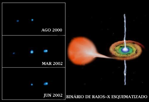 Painel da esquerda: série de imagens em raios-X da fonte XTEJ1550 obtida pelo Chandra (NASA); em Agosto de 2000 observa-se um jacto à esquerda do buraco negro do sistema XTEJ1550; em Março de 2002 aparece também um jacto à direita; 3 meses depois, o jacto da esquerda já não é detectado. Painel da direita: ilustração da formação de um disco de acreção à volta de um buraco negro num sistema binário. Crédito: esquerda, NASA/CXC; direita, CXC/M.Weiss.