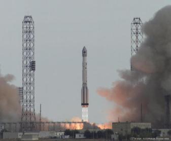 Lançamento do observatório INTEGRAL (ESA) a 17 de Outubro de 2002, em Baikonur (Cazaquistão). Os quatro instrumentos a bordo permitirão, pela primeira vez, efectuar simultaneamente observações na região do espectro do visível, dos raios-X e dos raios gama de alguns dos objectos mais energéticos do Universo. Crédito: ESA.