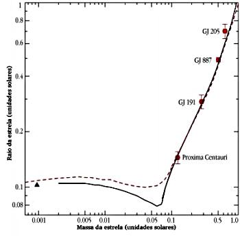 Gráfico mostrando a massa e o raio das estrelas de pequena massa observadas pelo VLTI (círculos vermelhos), a massa e o raio de Jupiter (triângulo azul) e a relação entre a massa e o raio estelar prevista por dois modelos teóricos correspondentes a diferentes idades, calculados por Gilles Charier e colaboradores (École Normale Supérieure de Lyon, França): 400 milhões de anos (linha a cheio) e 5 mil milhões de anos (linha a tracejado). Crédito: ESO.