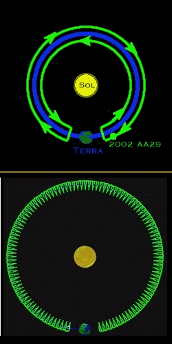 no âmbito do programa LINEAR (um projecto norte-americano de busca de asteróides) que recebeu o nome 2002 AA29. Esta pedra do espaço com 60 metros de diâmetro é o primeiro asteróide descoberto a coorbitar o SolUm asteróide é um pequeno corpo rochoso que orbita em torno do Sol, com uma dimensão que pode ir desde os 100 m até aos 1000 km. A maioria dos asteróides encontra-se entre as órbitas de Marte e de Júpiter. Também são designados por planetas menores.