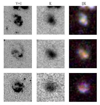 Três galáxias de grandes dimensões e muito distantes no HDF-S. Este tipo de galáxia nunca tinha sido observado a tão grandes distâncias. Têm um aspecto surpreendentemente semelhante ao de galáxias espirais muito próximas. As imagens nas colunas identificadas com \"V+I\" e \"K\" foram obtidas pelo telescópio espacial Hubble e VLT/ISAAC, respectivamente. A terceira coluna mostra imagens coloridas obtidas a partir da composição de imagens obtidas com os dois telescópios. Crédito: ESO.