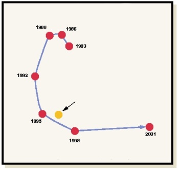 Trajecto da pequena estrela (bola vermelha) do sistema múltiplo T Tauri. A seta indica a posição do sistema duplo compacto (bola amarela). Crédito: Loinard, Rodríguez, e Rodríguez (UNAM, NRAO/AUI/NSF).