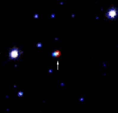 Imagem obtida pelo Telescópio Espacial Hubble, mostrando um objecto constituinte da matéria escura, um MACHO. Este MACHO, indicado pela seta, é uma estrela anã castanha que provocou um efeito de microlente gravitacional numa estrela azul que se encontra noutra galáxia. Crédito: ESA, ESO, e equipa do projecto MACHO.