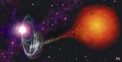 Ilustração de EF Eri durante a fase de transferência de massa da estrela dadora para a anã branca. A região onde a corrente fina de gás se rompe em muitos filamentos é onde o campo mágnetico da anã branca aprisiona o material. Crédito: Mark A. Garlick.