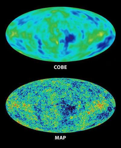 Mapa do Universo primordial, 380 000 anos após o Big Bang, ou seja, há mais de 13 mil milhões de anos. Em 1992, a sonda COBE da NASA detectou pela primeira vez padrões na luz mais antiga do Universo (figura de cima). O WMAP obteve um novo mapa destes padrões primordiais, mas muito mais pormenorizado (figura de baixo). As características do novo mapa são consistentes com as do mapa COBE, mas 35 vezes mais detalhadas. As cores indicam de \"mais quente\" (vermelho) a mais frio (azul). A forma oval corresponde a uma projecção de todo o céu, semelhante à forma dos mapas que representam o globo Terrestre. Crédito: NASA/WMAP Science Team.