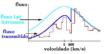 Comparação entre o espectro observado do quasar SDSS1122-0229 (vermelho) e o modelo proposto por Barkana e Loeb (azul escuro). Neste modelo, a emissão de hidrogénio (Lyman α) intrínseca do quasar, a azul claro, é parcialmente absorvida pelo gás de hidrogénio intergaláctico que, sob o efeito gravitacional do halo escuro de massa elevada, cai para dentro do quasar, resultando o perfil a azul escuro. Crédito: Barkana & Loeb 2003, Nature vol. 421 p. 341.