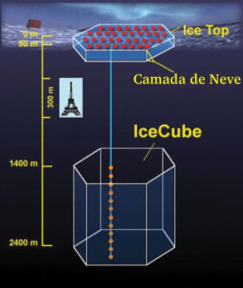 Aqui vemos esquematizado o detector de neutrinos IceCube, que ocupará 1 km3. Está representada (embora não esteja à escala) uma das 80 cordas de módulos ópticos que constituem o detector. À superfície encontra-se o IceTop, constituído por uma rede de sensores, que será utilizado para calibrar o IceCube e conduzir investigações sobre raios cósmicos da alta energia. Crédito: Darwin Rianto/NSF.