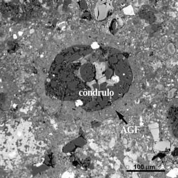 Imagem electrónica de um côndrulo rodeado por um anel de grãos finos (AGF), indicado pela seta, que reagiu com água. Esta é uma amostra retirada do condrito de Murray. Crédito: Dante Lauretta (Universidade do Arizona).