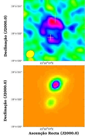 Em cima: Imagem obtida com o VLA mostrando a emissão do gás de CO desviada para o vermelho, revelando o efeito de lente conhecido por \"Anel de Einstein\"; as cruzes indicam a localização das imagens do quasar no óptico. Em baixo: Imagem do quasar PSS J2322+1944 nos comprimentos de onda do óptico, obtida no Observatório W. M. Keck, mostrando imagens gémeas que indicam o efeito de lente gravitacional. Crédito: G. Djorgovski, C. Carilli et al., NRAO/AUI/NSF.