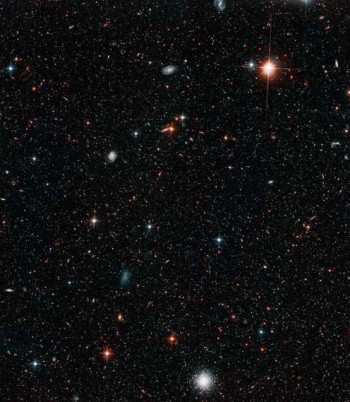 Estas observações revelaram ainda milhares de galáxias (ver imagem ao lado). Uma fracção significativa das galáxias visíveis na imagem, em plano de fundo, possui uma forma peculiar devida a colisões, o que vem confirmar o facto de que habitamos um universo vibrante e dinâmico em constante mutação.