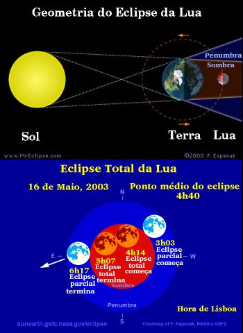Em cima: Diagrama que exemplifica o eclipse total da Lua, ilustrando os cones de sombra e de penumbra. Em baixo: Horário das etapas do eclipse total da Lua na madrugada de 16 de Maio de 2003, em Lisboa. Crédito: Fred Espenak, NASA/GSFC.