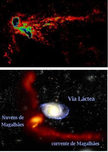 Em cima: Mapa de rádio das Nuvens de Magalhães, com a Corrente de Magalhães estendendo-se para a direita. Em baixo: Modelo da corrente de Magalhães. Esta simulação descreve a trajectória do gás, calculando as posições de 56 000 partículas de gás na Corrente. Crédito: Mapa de rádio: M.E. Putman (University of Colorado), L. Staveley-Smith (CSIRO), K.C. Freeman (Australian National University), B.K. Gibson (Swinburne University) & David G. Barnes (Swinburne University). Modelo: Daisuke Kawata, Chris Fluke, Sarah Maddison & Brad Gibson, Swinburne University of Technology, Australia.