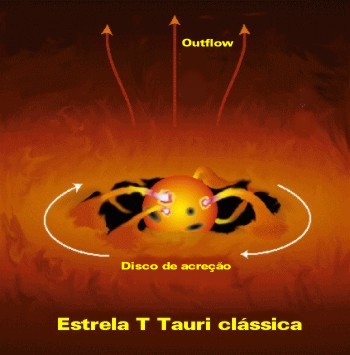 Esquema que ilustra uma estrela jovem do tipo T Tauri clássica, com um disco de acreção de gás e poeira circum-estelar rodando em torno da estrela central, e ainda um jacto bipolar (Outflow) emanando dos pólos da estrela, ao longo da direcção do eixo de rotação do sistema. O material do disco cai para a estrela central através de tubos de matéria controlados pelo campo magnético, criando pontos quentes na superfície da estrela. Crédito: Pete Hartigan (Rice University, EUA).