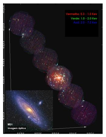 Imagem do eixo maior de Andrómeda composta por três cores em raios-X. As cores correspondem a raios-X macios (0.3 - 1.0 keV), médios (1.0 - 2.0 keV) e duros (2.0 - 7.0 keV). Podem ver-se numerosas fontes pontuais e difusas de raios-X. No canto inferior esquerdo mostra-se uma imagem óptica de M31. Crédito: S. Trudolyubov, Los Alamos National Laboratory.